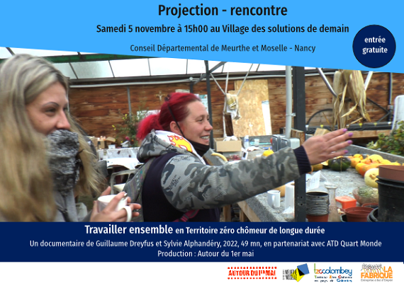 À l’occasion de notre premier festival TESSA, nous organisons plusieurs projections du film produit par Autour du 1er mai : Travailler ensemble en territoire zéro chômeur de longue durée. La toute première projection se tiendra le 5 novembre, à Nancy, lors du Village des solutions de demain.