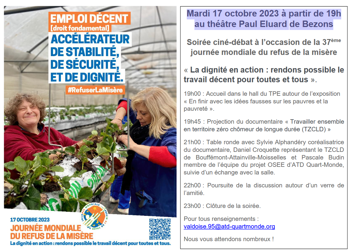 Cette soirée est organisée à l’occasion de la 37e journée mondiale du refus de la misère qui a pour thème cette année « La dignité en action : rendons possible le travail décent pour toutes et tous ».
